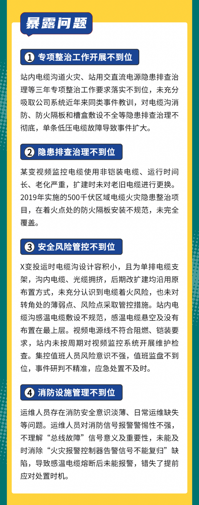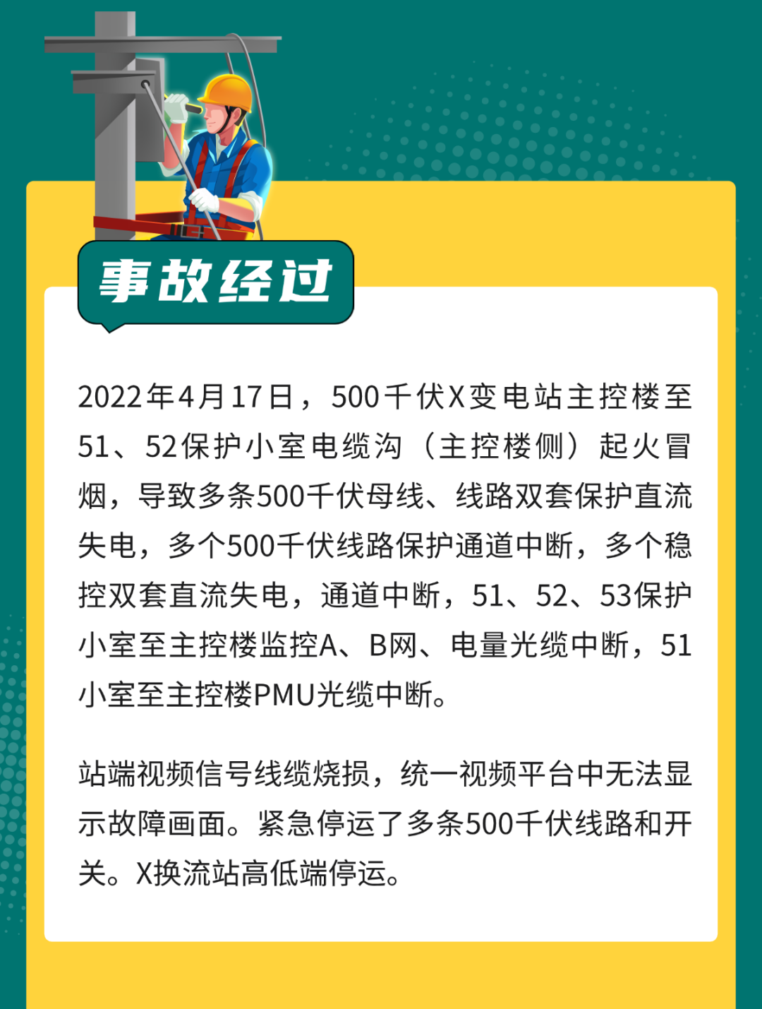 2022 年 4 月 17 日,某公司 500kV 一變電站,站內電纜溝電纜短路著火,導致 51、52 保護小室站用直流系統電源電纜受損,保護小室內 500kV 線路保護、500kV Ⅰ、Ⅱ 母線保護和站內穩控裝置失電,6 回路 500kV 路線被迫停運。