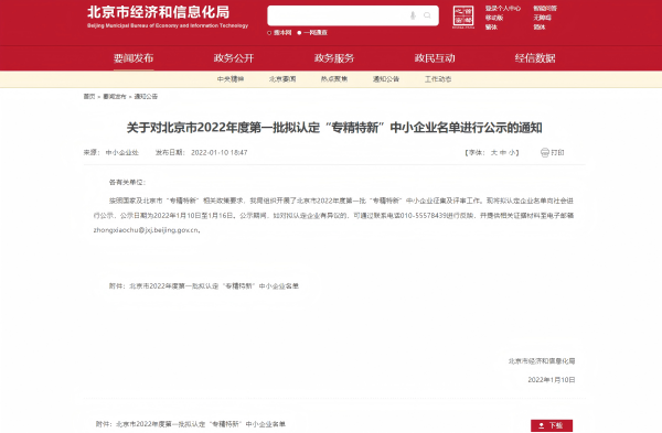 近日,北京市經濟和信息化局正式公布了2022年度第一批“專精特新”中小企業名單。